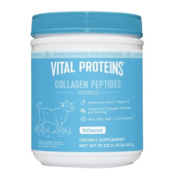 We regularly supplement with collagen powder, and Vital Proteins Collagen Peptides is one of our top choices. It’s a high-quality product that contains a good amount of ingredients to help boost collagen production.